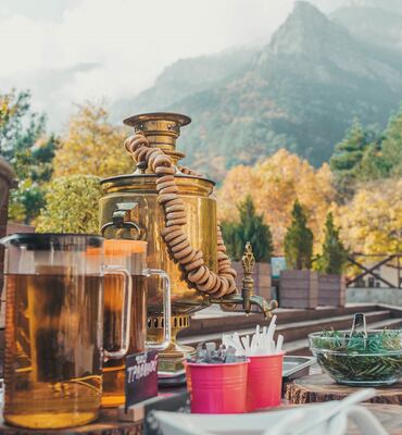 В это время на центральной площади отеля уже распален мангал, а шеф-повар умело добавляет жару для сочного барашка. Ещё пол часа, и каждый гость сможет насладиться вкусом мяса на свежем воздухе. На столе пыхтит настоящий самовар: кипятит воду горной речки, только и успевай подбрасывать шишки да щепки. Каждый желающий может приобщиться к живописи вином, попробовать свои силы в эко крестиках-ноликах и придумать дизайн своей забавной тыквы. Бассейн подогрет, а погода шепчет "пора окунуться".